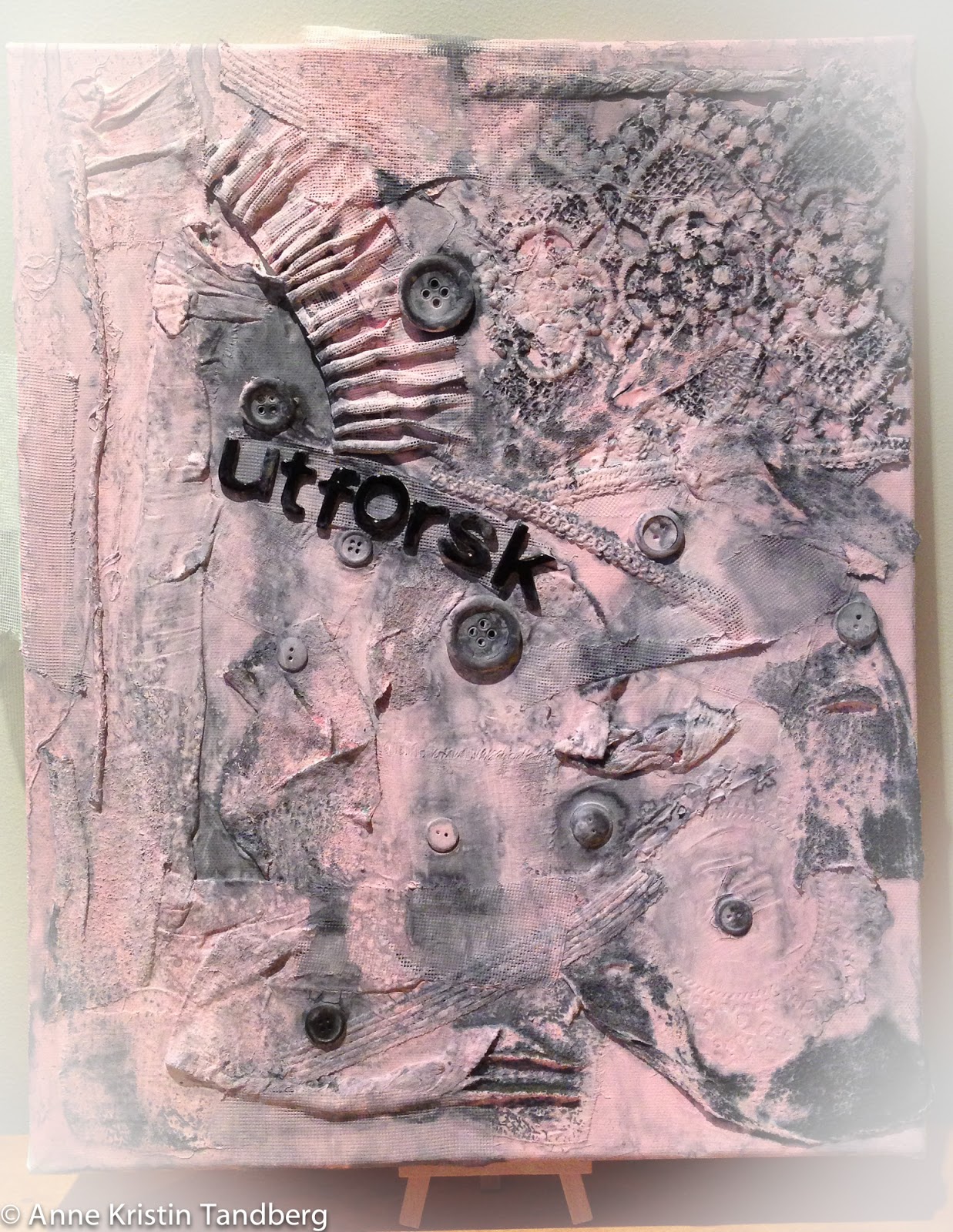 Det er flere mixed media artister som har bestemt seg for at et spesielt ord skal være førende for 2013. Jeg har valgt meg UTFORSK. Likte egentlig det engelske EXPLORE bedre - men syntes det var bedre å bruke et norsk ord. Oredet har jeg limt opp på en canvas jeg lagde i 2012. Det er et stort bilde, 13 x 14 tommer. For å lage bildet brukte jeg MYE gesso - la i gessoen alt mulig rart (knapper, blonder, lerret, hyssing, gamle gardiner) Deretter malte jeg det med rosa acrylmaling og sprayet det med svart dylusion. Bokstavene var i utgangspungtet grønne - de dekket jeg med gesso - sprayet så på svart dylusion (i 2 omganger for at det skulle dekke) hadde så på ART GEL.